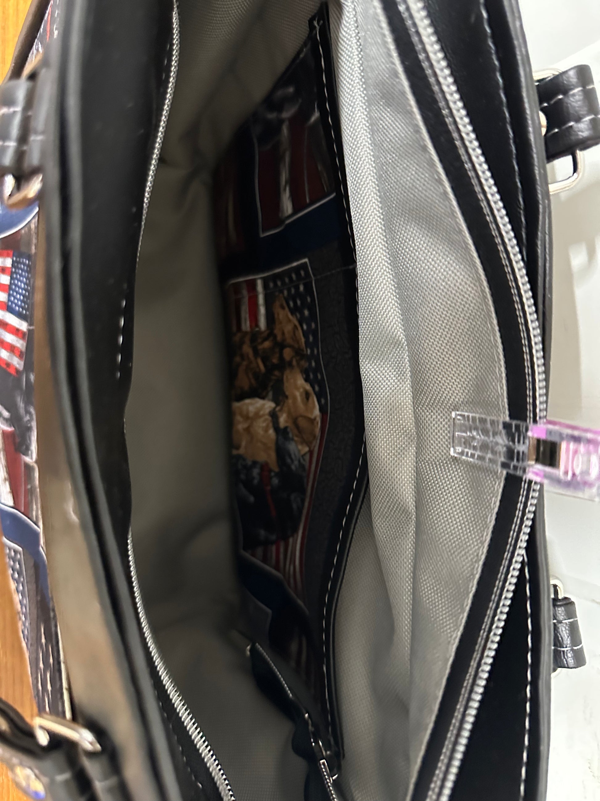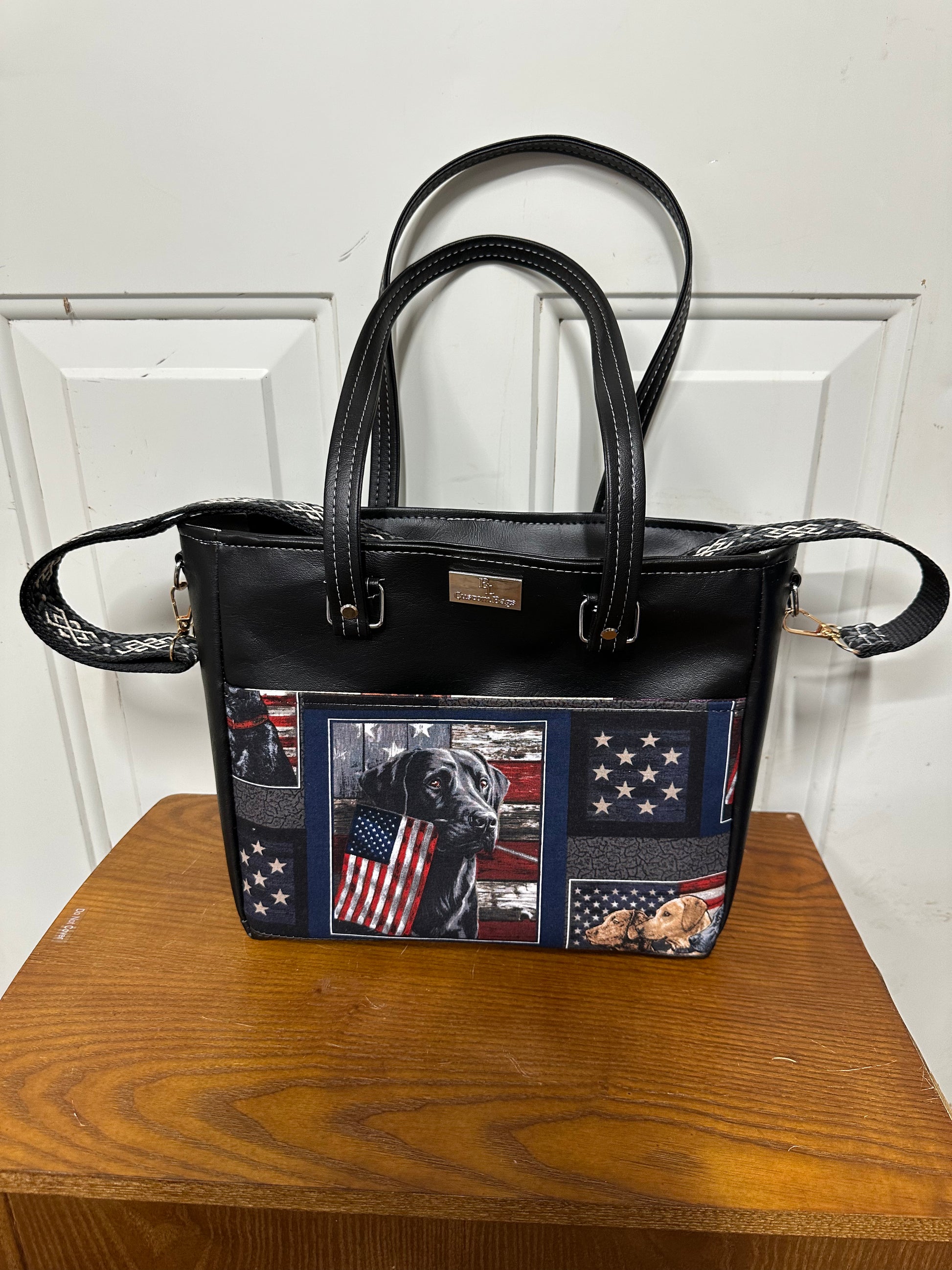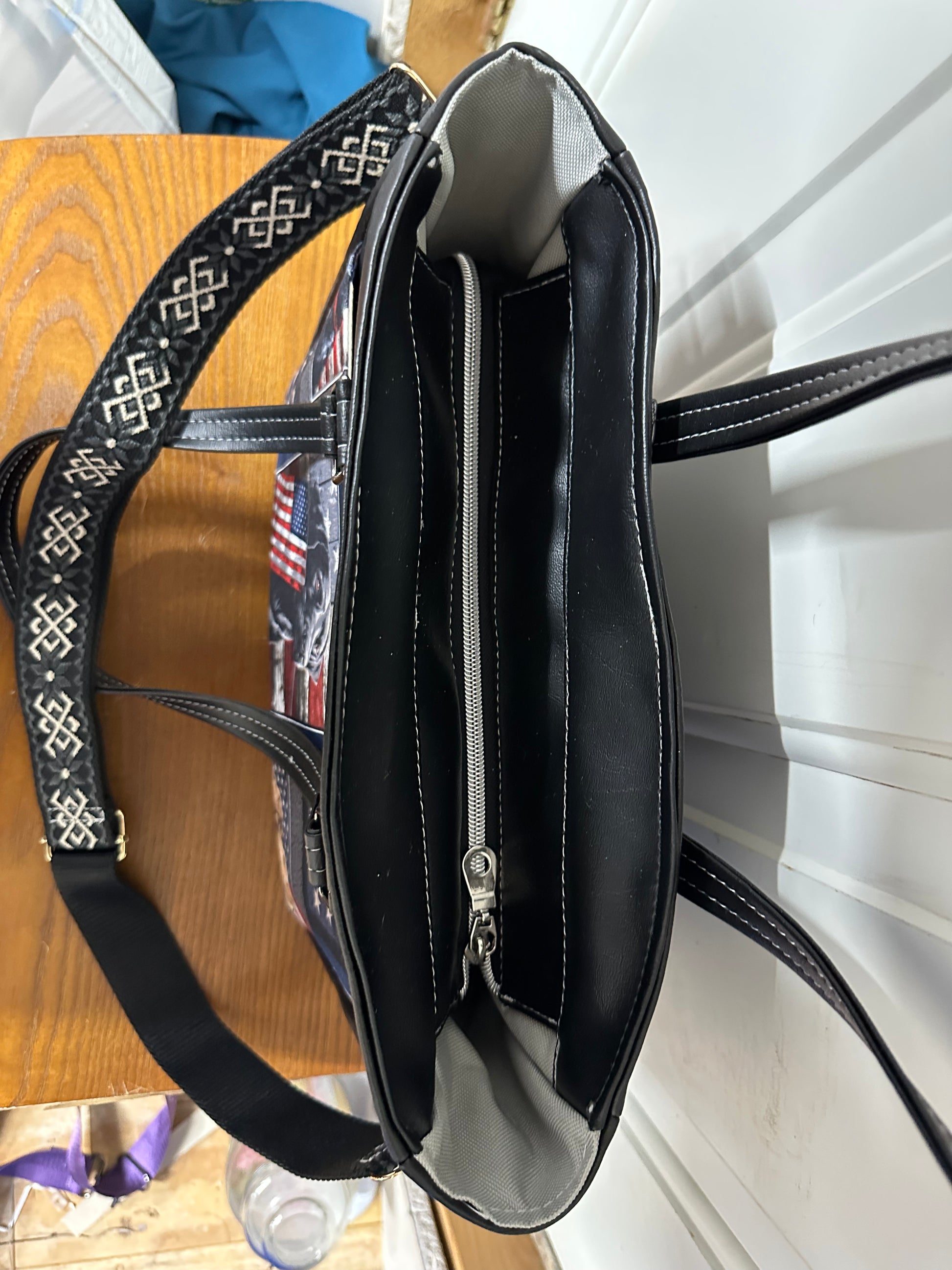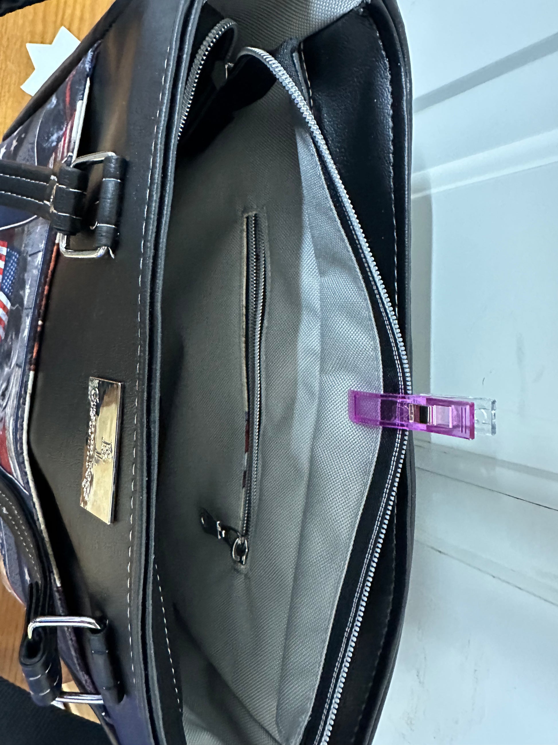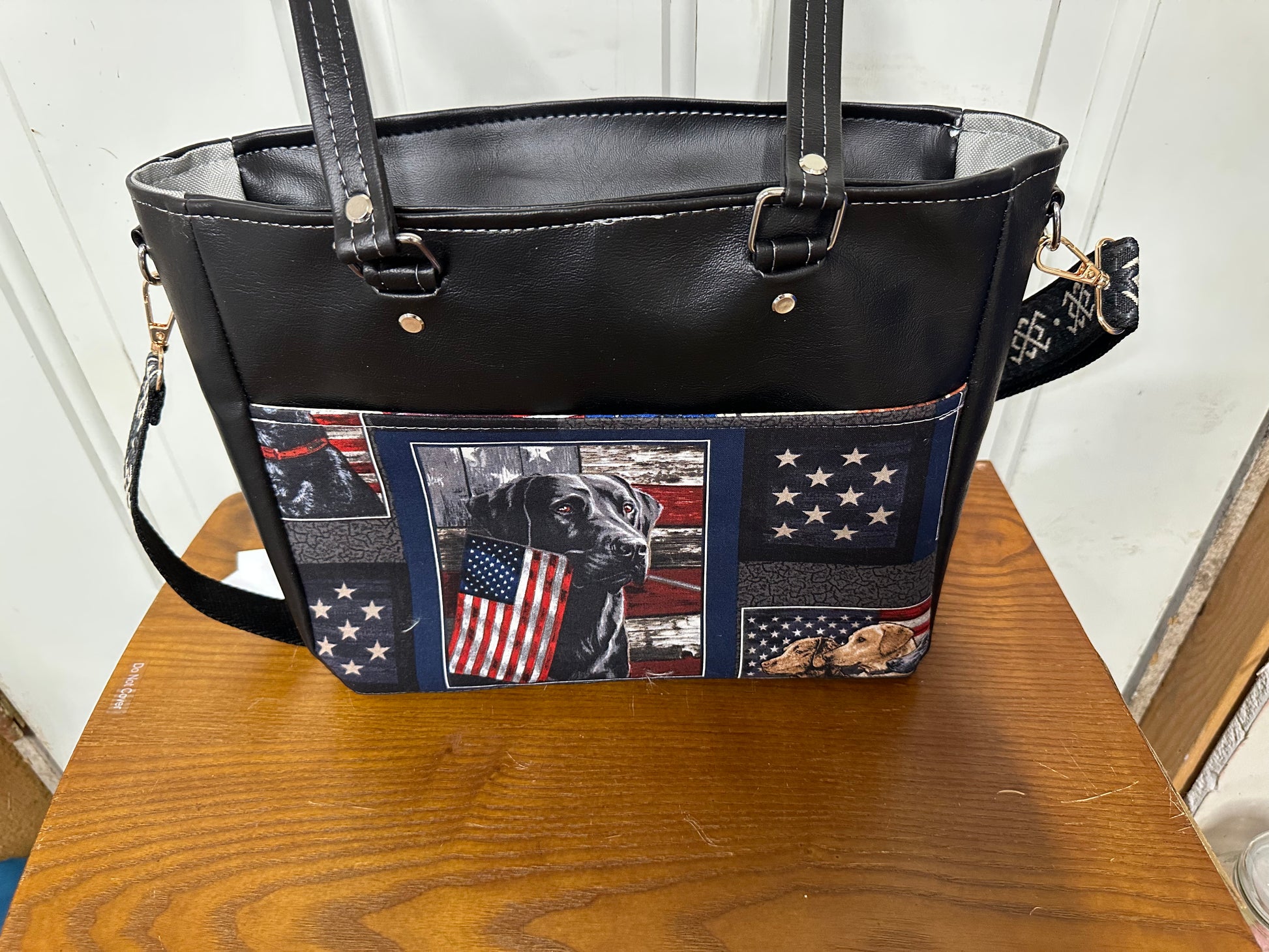 Your next tote bag is here. This tote features two outside slip pockets along with a slip pocket and zipper pocket on the inside. Tote measures at 12 by 10 by 6. Exterior of bag is black vinyl with cotton pockets, inside is waterproof canvas with cotton pockets.