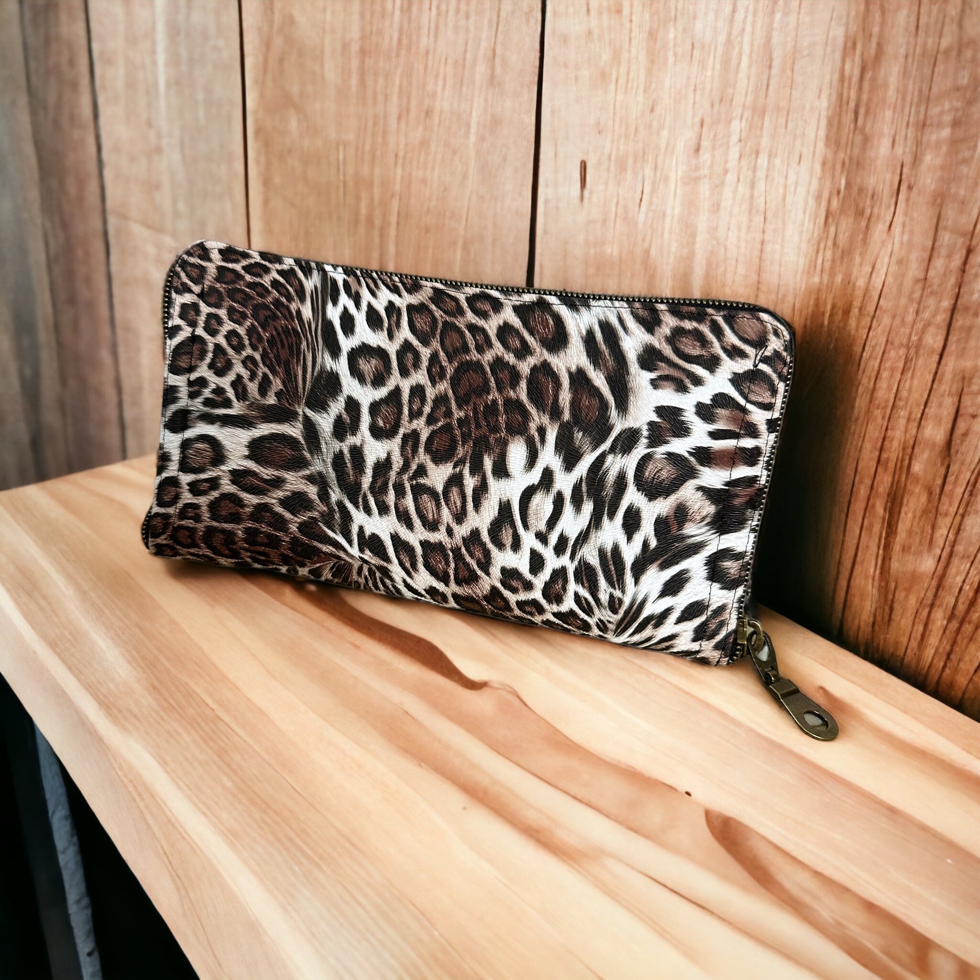 Brown Leopard Abby Wallet. Full vinyl outside with Cotton lining. Antique Brass is the hardware color through out. Inside you will find 6 cards slots on each side, and 2 slip pockets on each side along with a zipper pocket in the middle. Measures 8" by 4 when closed.