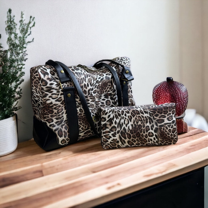 Brown Leopard Collette is made with a fully vinyl outside and Cotton lining inside. Inside you will find a zipper pocket and two slip pockets to hold your phone, pens or anything else that might need a pocket. Pictured with the Collette is the Abby wallet which is available separately. Antique Brass is the hardware throughout the bag.